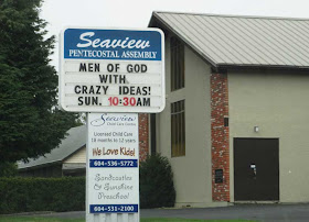 I'm not sure what the Religious Right is like in Canada, or if they even exist exactly, but this sign made me think that at least some of them have more of a sense of humor than their American cousins: